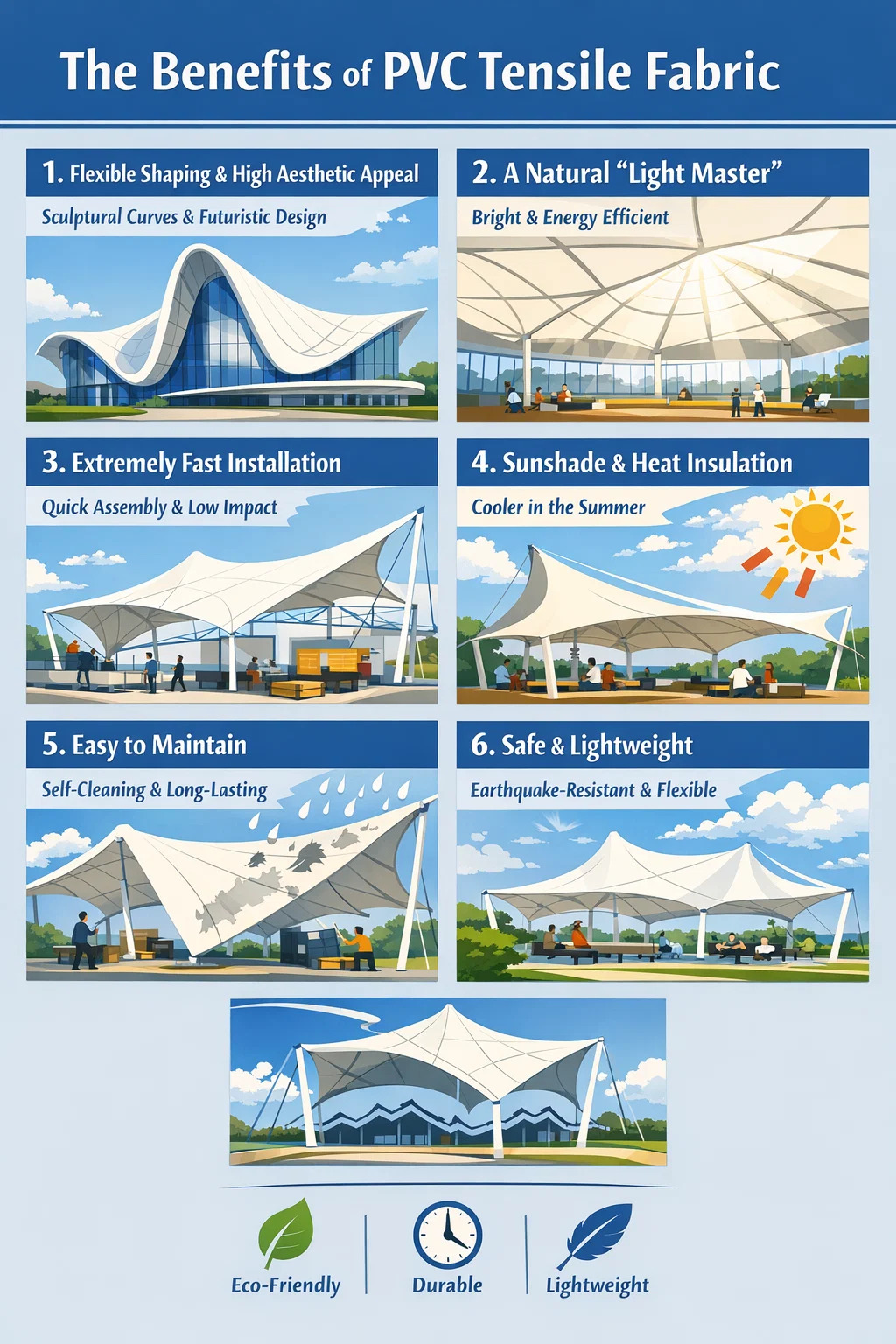Energiebesparing overdag: Vanwege de hoge lichttransmissie heeft de membraanstructuur overdag vrijwel geen kunstmatige verlichting nodig, wat zowel milieuvriendelijkheid als aanzienlijke elektriciteitsbesparingen oplevert.