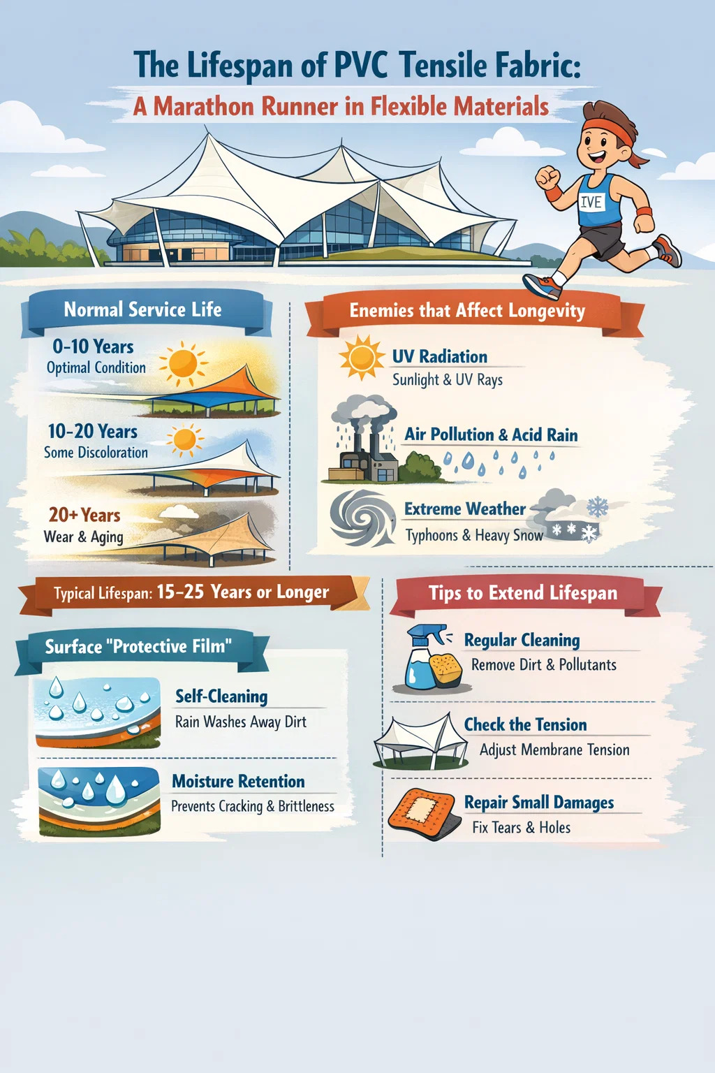 Wat betreft de levensduur van PVC-trekstof Simpel gezegd is het een soort hightech ‘schil’ die een gebouw geruime tijd kan begeleiden. Hoewel het misschien niet honderd jaar meegaat zoals bakstenen en tegels, is het zeker een duurzame "marathonloper" in de wereld van flexibele materialen.