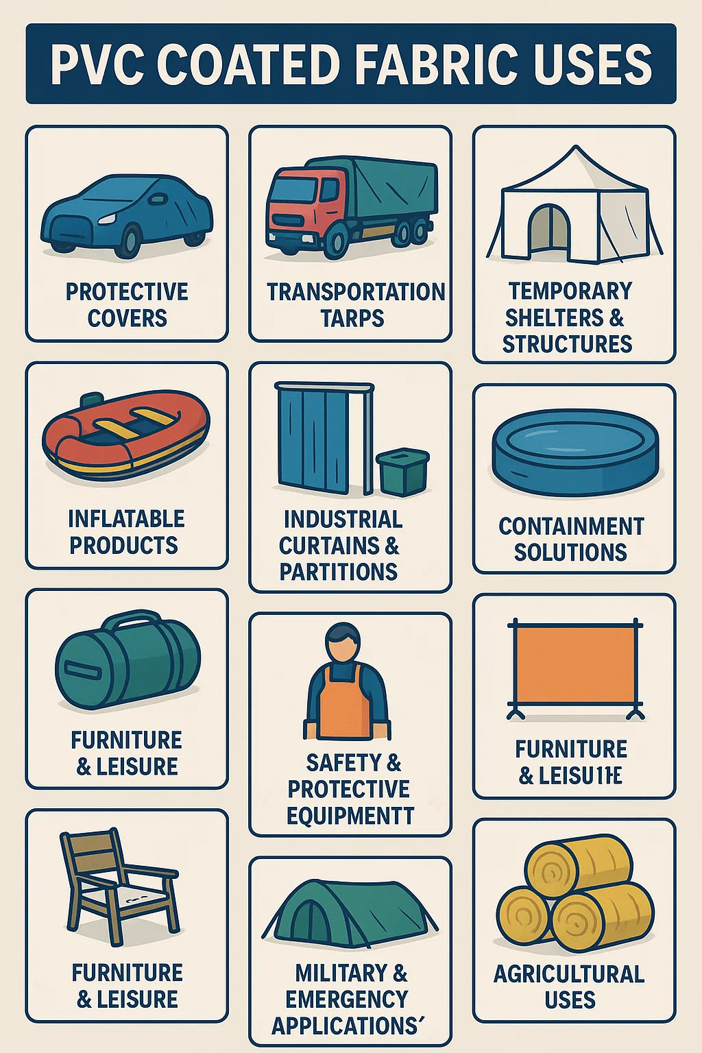 Hier vindt u een overzicht van veelvoorkomende toepassingen voor PVC-gecoate stof , als weerspiegeling van de praktische toepassingen ervan: